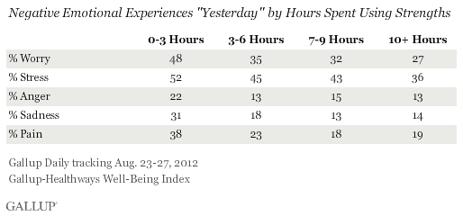 The more hours per day Americans get to use their strengths to do what they do best, the less likely they are to report experiencing worry, stress, anger, sadness, or physical pain…